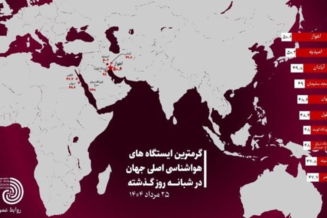 از بین ایستگاههایی که اطلاعات خود را بهصورت بین المللی به اشتراک میگذارند، اهواز با دمای 50.6 درجه سلسیوس بالاترین دما را در بین ایستگاههای هواشناسی داشته است.