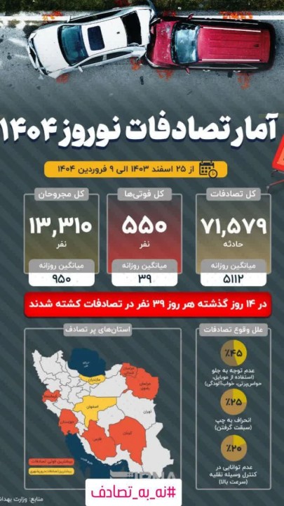 تعطیلات نوروز 1404 با ثبت بیش از 71 هزار تصادف، آمار تکاندهندهای از تلفات و خسارات برجای گذاشته است. گزارشهای رسمی نشان میدهد که از 25 اسفند 1403 تا 9 فروردین 1404، مجموعاً 550 نفر در سوانح جادهای جان خود را از دست دادهاند و 13,310 نفر نیز مجروح شدهاند. بررسی این آمار حاکی از آن است که روزانه بهطور متوسط 5,113 حادثه رانندگی رخ داده، 39 نفر جان باخته و 950 نفر مصدوم شدهاند.